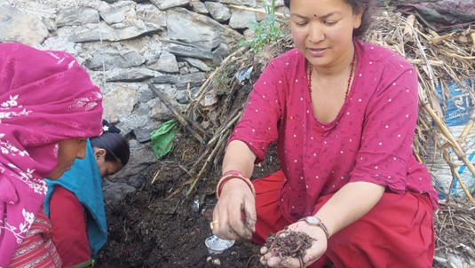 Beyond just producing compost, Chinimaya has become a central figure in ensuring the distribution of high-quality organic fertilizer. She started small by producing vermicompost at home and has already earned NPR 10,000 from it. But this is just the beginning. Now, she is an important member of the Bottle House team, actively engaged in vermicompost production, sales, and training other farmers in this technique. She also earns at least NPR 10,000 per month from selling vegetables.