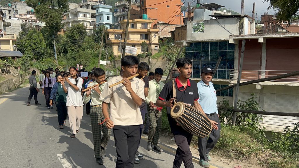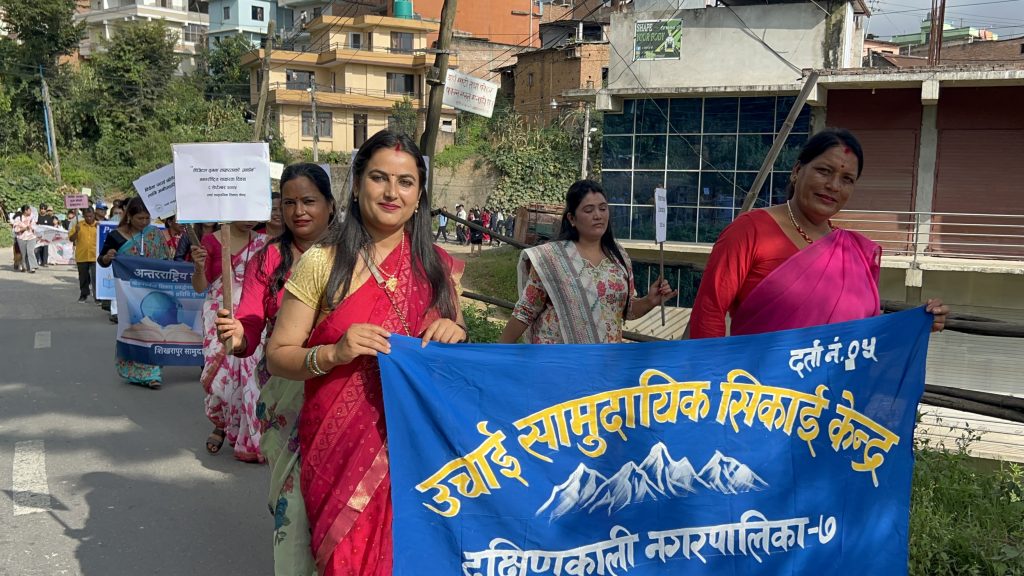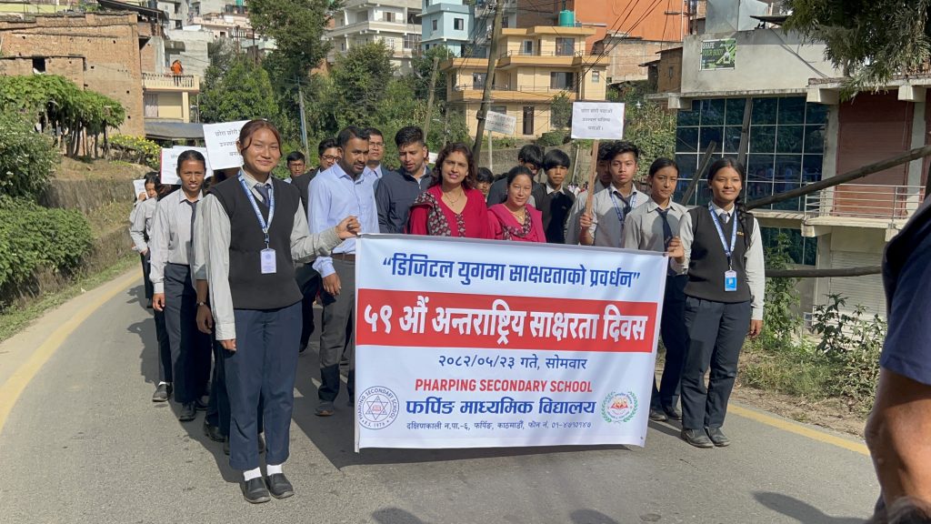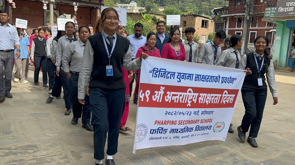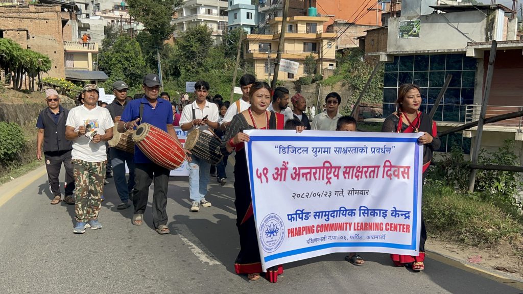 The main event featured a literacy rally through Pharping city, accompanied by traditional cultural instrumental musical groups. More than 500 participants joined the rally, including open school mothers, income generation groups, college and school students, alternative learning participants, and community members. The rally began from the football ground in the heart of Pharping and proceeded through historic parts of the city before concluding at the premises of Dakshinkali Municipality.